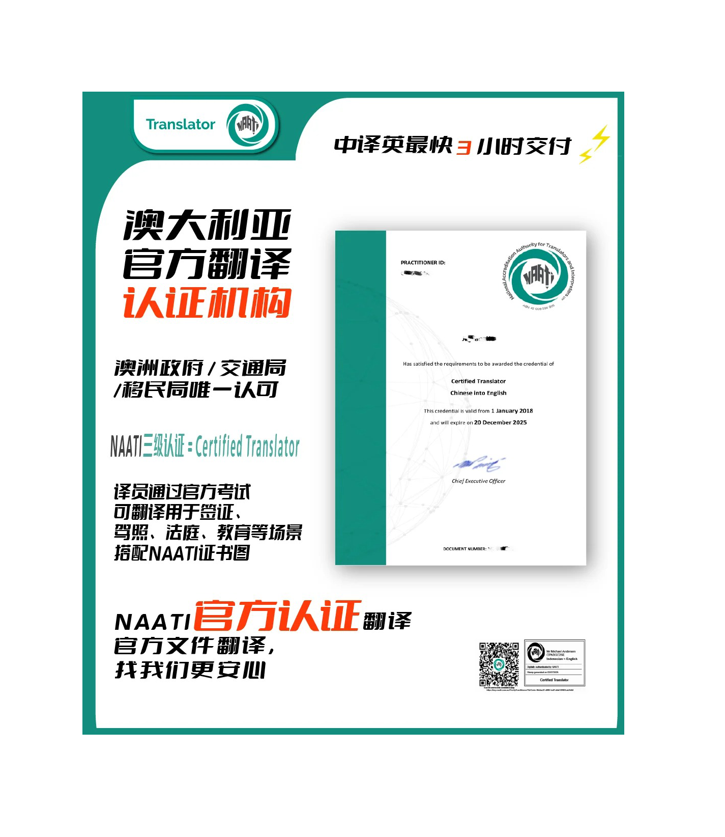 NAATI 是National Accreditation Authority for Translators and Interpreters的简称,是澳大利亚官方认可的翻译专业认证机构。每一份翻译件通过NAATI认证的译员,会有其对应的从业者编号及印章。